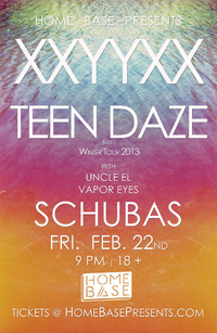 My next gig is at Schuba’s in Chicago, where me and my Push Beats brother Uncle El will be opening for xxyyxx and Teen Daze.  The show has sold out, but there are opportunities to still win some tix for yourself by following Home Base on Facebook.  Can’t wait to rock for y’all here!  UPDATE (2/20): Teen Daze has had to cancel his performances on this tour due to visa issues, Groundislava will be filling in on the Chicago date.