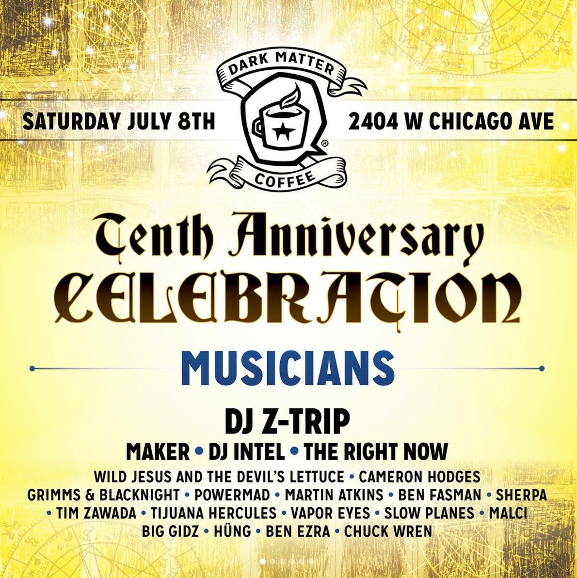 Saturday, July 8th its an all day celebration for Dark Matter Coffee’s 10th anniversary! Catch dope block party vibes with an A-list of food, booze and music with all proceeds going to benefit the Hope For The Day organization. I play at 1pm.