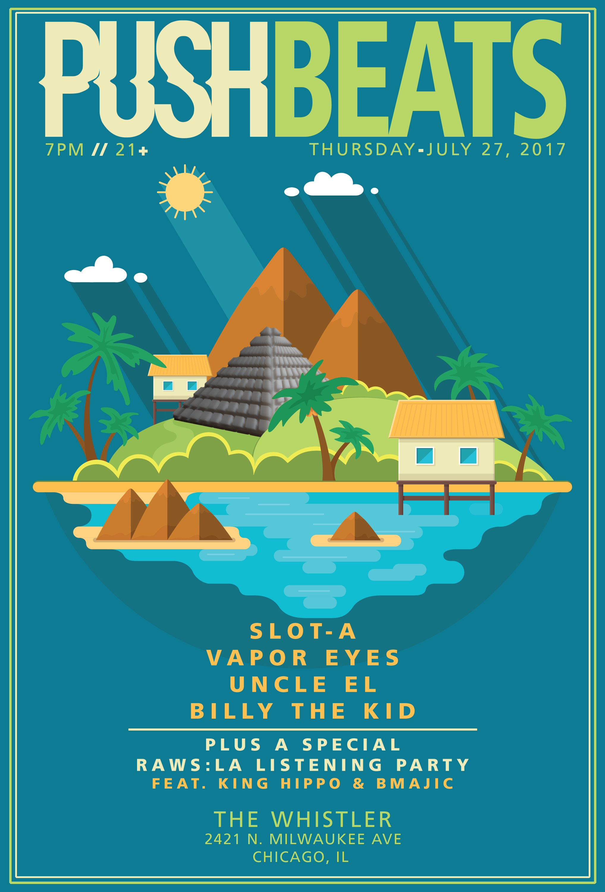 Thursday, July 27th catch me rockin’ The Whistler in Chicago with my Push Beats fam. Also, special RAWS:LA listening party beforehand. Doors open early for an awesome nite of music & beats.